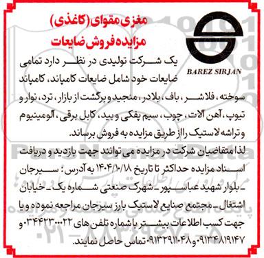 اسناد مزایده حداکثر تا تاریخ 1404.10.18 به آدرس : سیرجان- بلوار شهید عباسپور - شهرک صنعتی شماره یک - خیابان اشتغال - مجتمع صنایع لاستیک بارز سیرجان مراجعه نموده و یا
