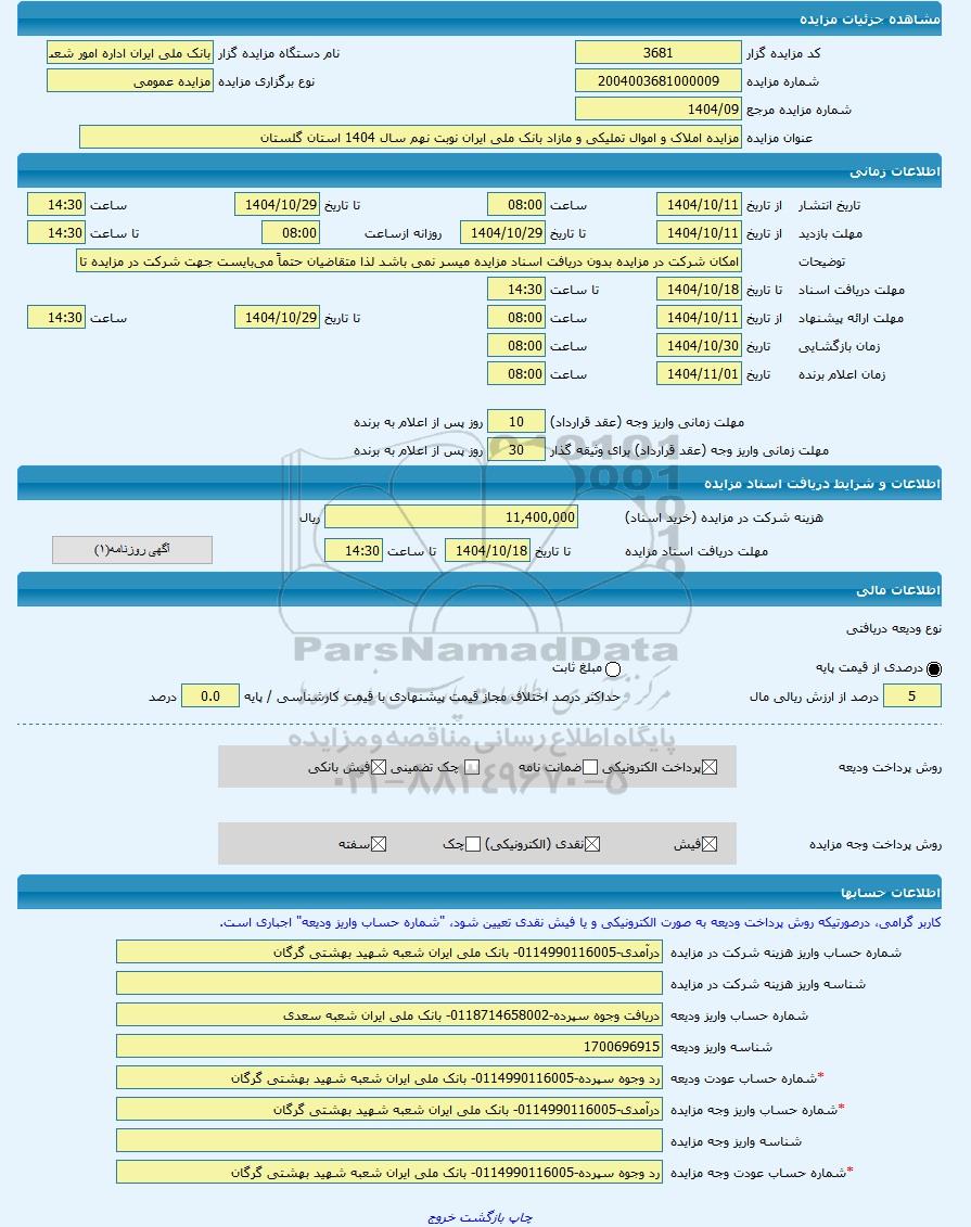 کد مزایده گزارنام دستگاه مزایده گزاربانک ملی ایران اداره امور شعب استان گلستان