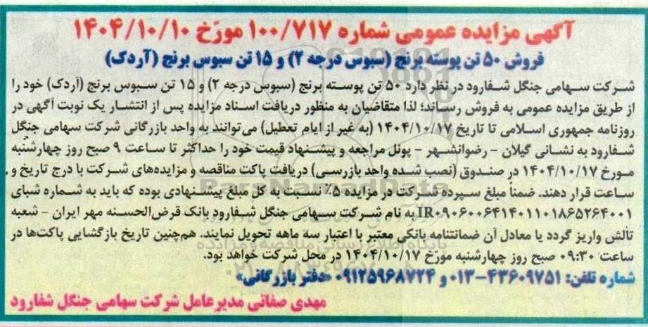 شرکت سهامی جنگل شفارود در نظر دارد 50 تن پوسته برنج (سبوس درجه 2) و 15 تن سبوس برنج (آردک) خود را از طریق مزایده عمومی به فروش رساند؛ لذا متقاضیان به منظور دریافت اسناد مزایده پس از انتشار یک نوبت آگهی در روزنامه جمهوری اسلامی تا تاریخ 1404.10.17 به غیر از ایام تعطیل میتوانند به واحد بازرگانی شرکت سهامی جنگل شفارود به نشانی گیلان - رضوانشهر - پونل مراجعه و پیشنهاد قیمت خود را حداکثر تا ساعت 9 صبح روز چهارشنبه مورخ 1404.10.17 در صندوق نصب شده واحد بازرسی دریافت پاکت مناقصه و مزایده های شرکت با درج تاریخ و ساعت قرار دهند. ضمناً مبلغ سپرده شرکت در مزایده 5% نسبت به کل مبلغ پیشنهادی بوده که باید به شماره شبای IR090600641401101865264001 به نام شرکت سهامی جنگل شفارود بانک قرض الحسنه مهر ایران - شعبه تالش واریز گردد یا معادل آن ضمانتنامه بانکی معتبر با اعتبار سه ماهه تحویل نمایند. هم چنین تاریخ بازگشایی پاکتها در ساعت 09:30 صبح روز چهارشنبه مورخ 1404.10.17 در محل شرکت خواهد بود.