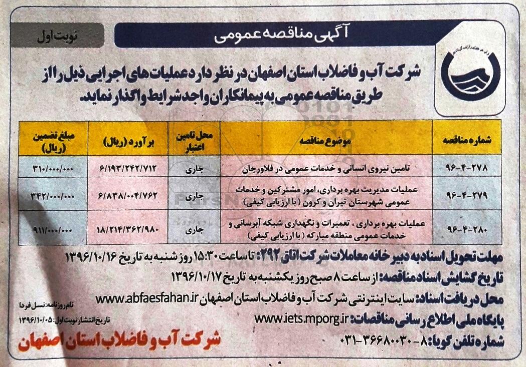 شرکت آب و فاضلاب استان اصفهان در نظر دارد عملیات های اجرایی ذیل را از طریق مناقصه عمومی به پیمانکاران واجد شرایط واگذار نماید.