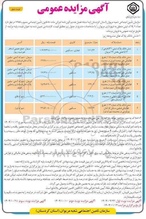 سازمان تامین اجتماعی شعبه مریوان (استان کردستان) به استناد فصل هشتم آئین نامه اجرایی ماده 50 قانون تامین اجتماعی مصوب 1355 در نظر دارد تعداد 5 پلاک ثبتی متعلق به شهرداری مریوان را با مشخصات مندرج در جدول زیر مطابق قیمت کارشناسی تعیین شده به عنوان قیمت پایه مزایده از طریق مزایده عمومی به فروش برساند.