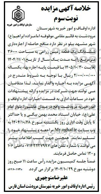 مرودشت به قائم مقامی موقوفه امامزاده ابراهیم (ع) شهر مشهد بیلو در نظر دارد منافع حاصله از اجاره داری ششدانگ یک قطعه زمین زارعی به مساحت 36000 متر مربع را به مدت یک سال از تاریخ 1404.11.1 لغایت 1405.10.30 با قیمت پایه اجاره بهای یک ساله 2.000.000.000 ریال با توجه به شروط مندرج در آگهی مزایده به اجاره واگذار نماید. لذا متقاضیان می توانند جهت شرکت در مزایده و ارائه پیشنهادات خود را در ساعات اداری به قسمت اجارات اداره اوقاف و امور خیریه مرودشت واقع در میدان عاشورا بلوار امام علی (ع)، خیابان استاد محمد بهمن بیگی و یا حداکثر تا پایان وقت اداری روز یکشنبه مورخ 1404.10.28 به وب سایت MY.oghafir مراجعه و پیشنهاد خود را تسلیم نمایند. همچنین جهت کسب اطلاعات بیشتر می توانند با شماره تلفنهای 07143227997 داخلی 106 و 120 تماس حاصل فرمایند.