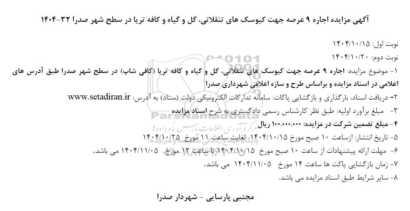 آگهی مزایده اجاره 9 عرصه جهت کیوسکهای تنقلاتی گل و گیاه و کافه تریا در سطح شهر صدرا 32-1404