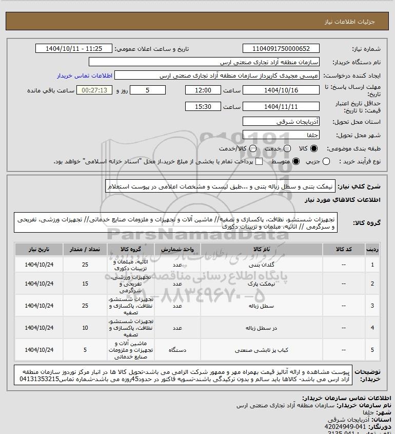 استعلام بها و موضوع استعلام استعلام نیمکت بتنی و سطل زباله بتنی و ...طبق لیست و مشخصات اعلامی در پیوست استعلام به اطلاع کلیه شرکتها و افراد متخصص واجد شرایط میرساند، آگهی گذار در نظر دارد از طریق استعلام بها، نسبت به انتخاب و دریافت پیشنهادات اقدام نماید. این استعلام با کد آگهی ثبت شده در سامانه خبرگزاری پارس نماد : 10083858 منتشر شده است. مشخصات استعلام : تاریخ شروع استعلام: 1404/10/11 آخرین مهلت ارسال پیشنهاد قیمت : 1404/10/16 و محل اجرای پروژه : استان مناقصات استان آذربایجان شرقی میباشد. استعلام قیمت مورد درخواست : استعلام نیمکت بتنی و سطل زباله بتنی و ...طبق لیست و مشخصات اعلامی در پیوست استعلام با دستهبندیهای تخصصی و گروه های مرتبط : تجهیزات آشپزخانه, تجهیزات پارک و مبلمان شهری, تجهیزات و خدمات کشاورزی و دامپروری, قطعات بتنی, استعلام اطلاع رسانی میگردد.