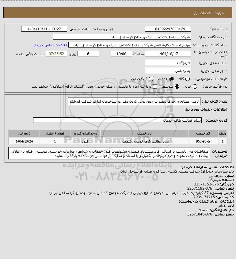 شرح کلی نیاز: تامین مصالح و اجرای تعمیرات ودیوارپوش کردن دفتر در ساختمان اداری شرکت ایزوایکو