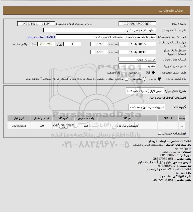شرح کلی نیاز: پارس لاواژ ( مصرف ارتوپدی )