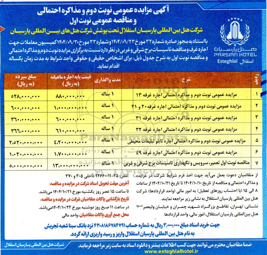 از متقاضیان دعوت بعمل می آید جهت اخذ فرم شرایط شرکت در مزایده و مذاکره احتمالی و مناقصه از تاریخ 1404.10.10 تا تاریخ 1404.10.21 از ساعات 8 الی 15 (با احتساب روزهای تعطیل) به امور مالی (واحد قراردادها) شرکت هتل بین المللی پارسیان استقلال به آدرس زیر مراجعه نمایند.