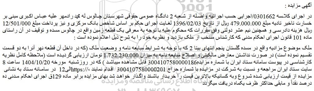 در اجرای کلاسه 0301662/اجرایی حسب اجرائیه واصله از شعبه 2 دادگاه عمومی حقوقی شهرستان چالوس له محمد رادمهر علیه عباس اکبری مبنی بر خسارت تاخیر تادیه مبلغ 479.000.000 ریال از تاریخ 1396/02/03 لغایت اجرای حکم بر اساس شاخص بانک مرکزی و نیز پرداخت مبلغ 12/501/000 ریال هزینه دادرسی و همچنین نیم عشر دولتی وفق مقررات که محکوم علیه با توجه به معرفی یک قطعه زمین واقع در چالوس مسده و توقیف در آن راستای ماده 101 قانون اجرای احکام مدنی که کارشناس منتخب از ملک بازدید و نظریه خود را به شرح ذیل اعلام نموده است :
