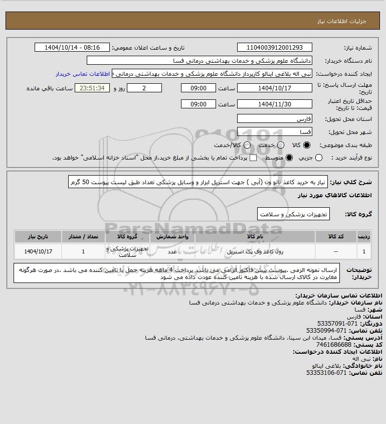 استعلام بها و موضوع استعلام استعلام نیاز به خرید کاغذ نانو ون (آبی ) جهت استریل ابزار و وسایل پزشکی تعداد طبق لیست پیوست 50 گرم به اطلاع کلیه شرکتها و افراد متخصص واجد شرایط میرساند، آگهی گذار در نظر دارد از طریق استعلام بها، نسبت به انتخاب و دریافت پیشنهادات اقدام نماید. این استعلام با کد آگهی ثبت شده در سامانه خبرگزاری پارس نماد : 10086418 منتشر شده است. مشخصات استعلام : تاریخ شروع استعلام: 1404/10/14 آخرین مهلت ارسال پیشنهاد قیمت : 1404/10/17 و محل اجرای پروژه : استان مناقصات استان فارس میباشد. استعلام قیمت مورد درخواست : استعلام نیاز به خرید کاغذ نانو ون (آبی ) جهت استریل ابزار و وسایل پزشکی تعداد طبق لیست پیوست 50 گرم با دستهبندیهای تخصصی و گروه های مرتبط : خدمات و تجهیزات آزمایشگاهی و پزشکی, کاغذ و فرم پیوست, استعلام اطلاع رسانی میگردد.