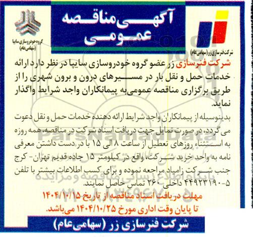 شرکت فنرسازی زر عضو گروه خودروسازی سایپا در نظر دارد ارائه خدمات حمل و نقل بار در مسیرهای درون و برون شهری را از طریق برگزاری مناقصه عمومی به پیمانکاران واجد شرایط واگذار نماید.