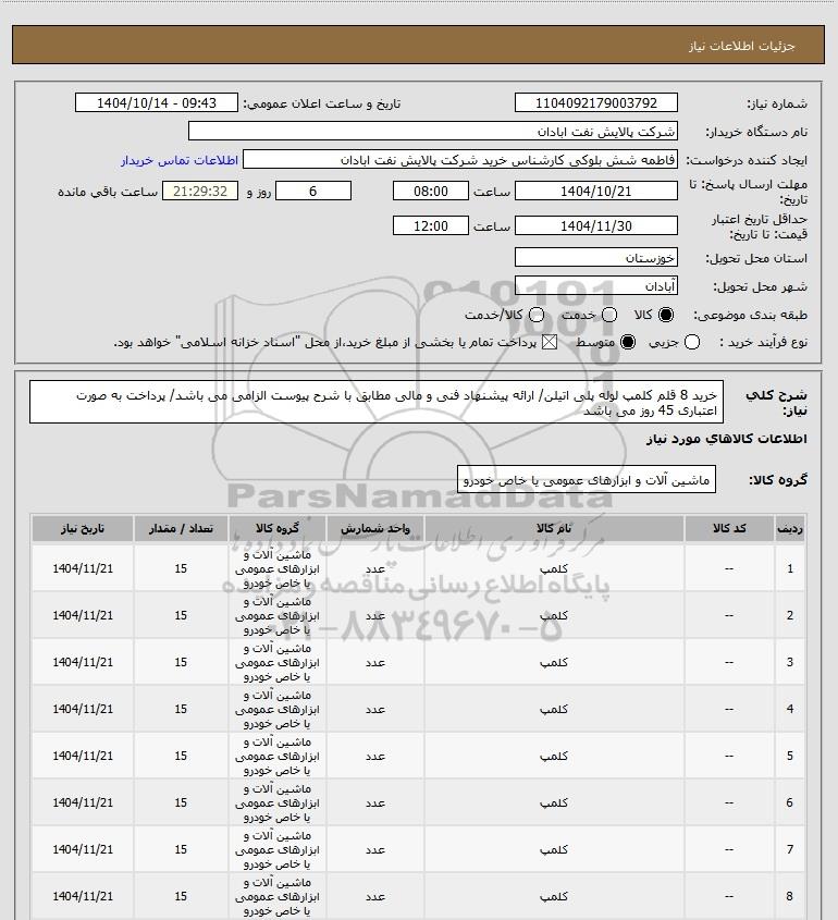 | 8 | -- | کلمپ | عدد | ماشین آلات و ابزارهای عمومی یا خاص خودرو | 15 | 1404/11/21 |