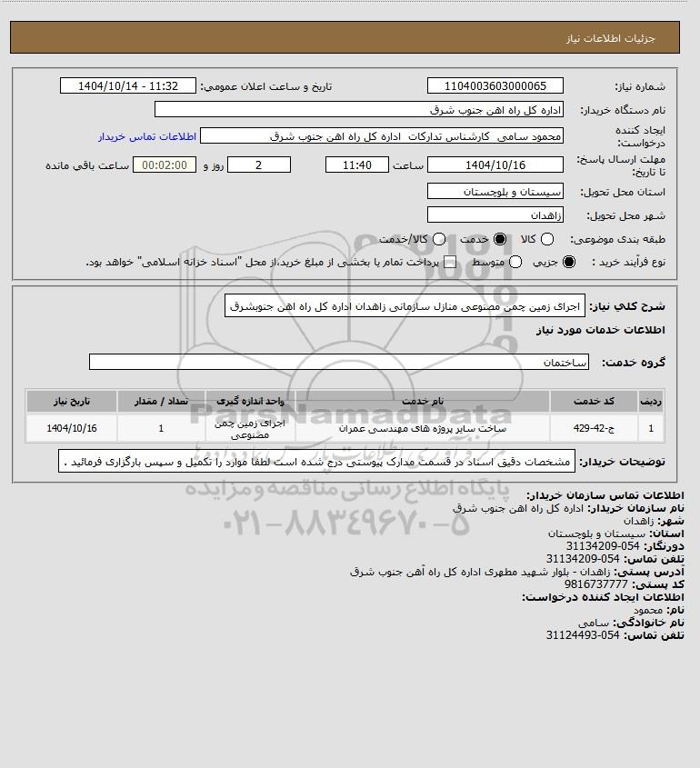شرح کلی نیاز: اجرای زمین چمن مصنوعی منازل سازمانی زاهدان اداره کل راه اهن جنوبشرق