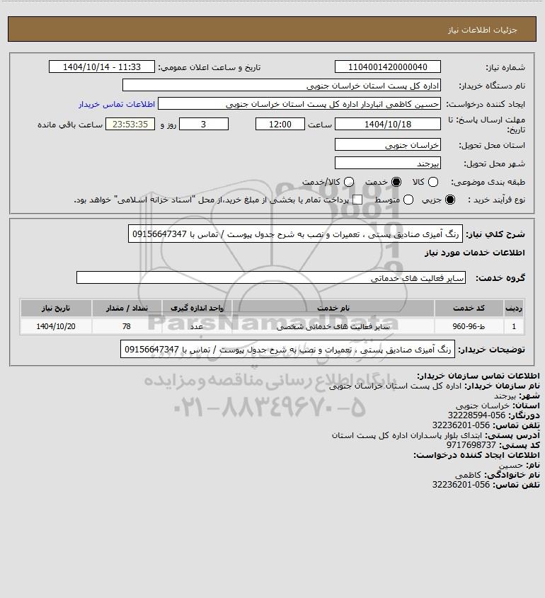 شرح کلی نیاز: رنگ آمیزی صنادیق پستی ، تعمیرات و نصب به شرح جدول پیوست / تماس با 09156647347