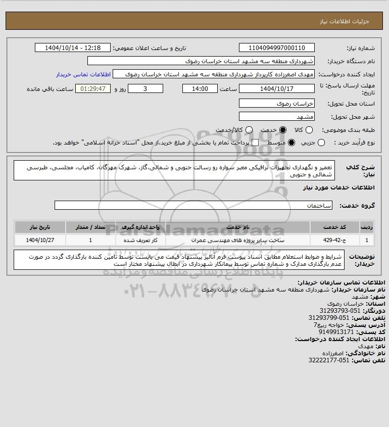 شرح کلی نیاز: تعمیر و نگهداری تجهیزات ترافیکی معبر سواره رو رسالت جنوبی و شمالی،گاز، شهرک مهرگان، کامیاب، مجلسی، طبرسی شمالی و جنوبی