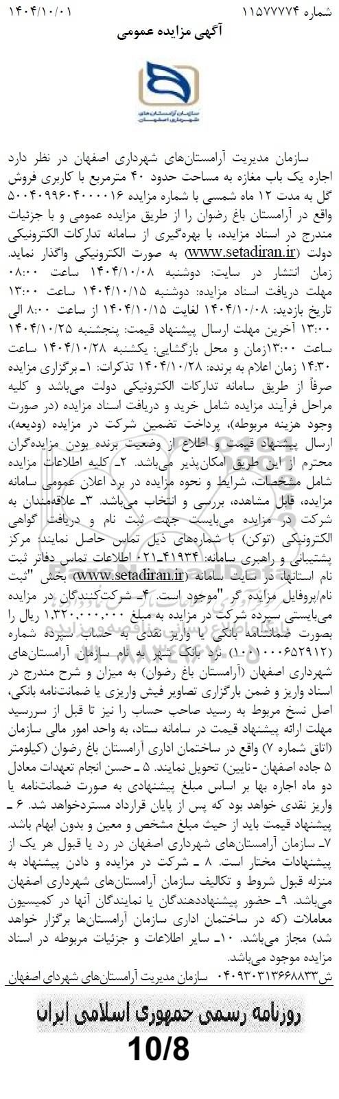 سازمان مدیریت آرامستان های شهرداری اصفهان در نظر دارد اجاره یک باب مغازه به مساحت حدود 40 مترمربع با کاربری فروش گل به مدت 12 ماه شمسی با شماره مزایده 5004099604000016 واقع در آرامستان باغ رضوان را از طریق مزایده عمومی و با جزئیات مندرج در اسناد مزایده با بهره گیری از سامانه تدارکات الکترونیکی دولت (ستاد ایران) به صورت الکترونیکی واگذار نماید. زمان انتشار در سایت: دوشنبه 1404.10.08 ساعت 08:00 مهلت دریافت اسناد مزایده: دوشنبه 1404.10.15 ساعت 13:00 تاریخ بازدید: 1404.10.08 لغایت 1404.10.15 از ساعت 8:00 الی 13:00 آخرین مهلت ارسال پیشنهاد قیمت: پنجشنبه 1404.10.25 ساعت 13:00 زمان و محل بازگشایی: یکشنبه 1404.10.28 ساعت 14:30 زمان اعلام به برنده: 1404.10.28