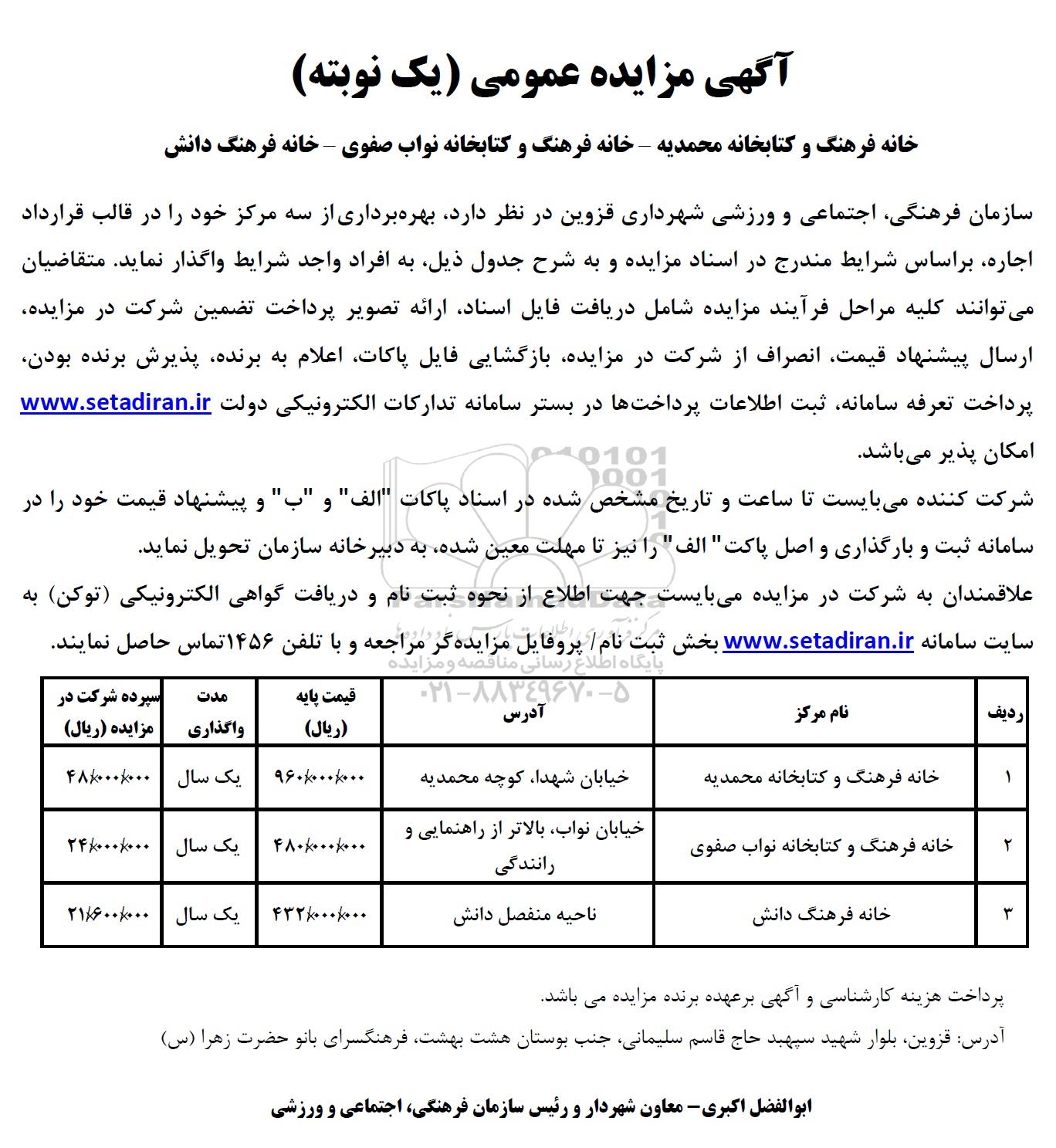 سازمان فرهنگی اجتماعی و ورزشی شهرداری قزوین در نظر دارد بهره برداری از سه مرکز خود را در قالب قرارداد اجاره براساس شرایط مندرج در اسناد مزایده و به شرح جدول ذیل به افراد واجد شرایط واگذار نماید. متقاضیان میتوانند کلیه مراحل فرآیند مزایده شامل دریافت فایل اسناد ارائه تصویر پرداخت تضمین شرکت در مزایده ارسال پیشنهاد ،قیمت انصراف از شرکت در مزایده بازگشایی فایل ،پاکات اعلام به برنده پذیرش برنده بودن پرداخت تعرفه سامانه ثبت اطلاعات پرداختها در بستر سامانه تدارکات الکترونیکی دولت ستاد ایران امکان پذیر میباشد.