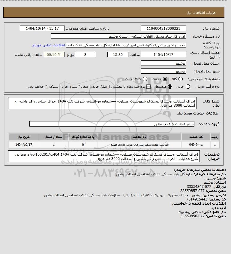 شرح کلی نیاز: اجرای آسفالت روستای عسکری شهرستان عسلویه ––شماره موافقتنامه شرکت نفت 1404 اجرای اساس و قیر پاشی و آسفالت 3000 متر مربع