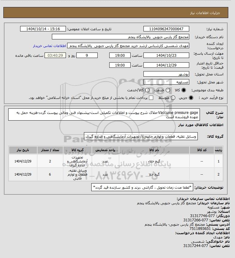 شرح کلی نیاز: Vaccume pressure gage-ملاک شرح پیوست و اطلاعات تکمیلی است-پیشنهاد فنی ومالی پیوست گردد-هزینه حمل به عهده فروشنده است