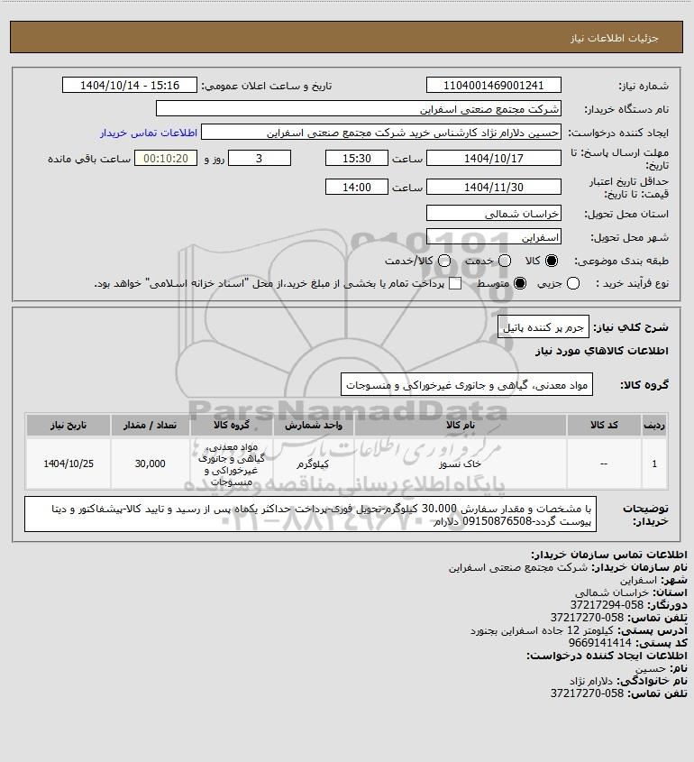 | 1 | -- | خاک نسوز | کیلوگرم | مواد معدنی، گیاهی و جانوری غیرخوراکی و منسوجات | 30,000 | 1404/10/25 |