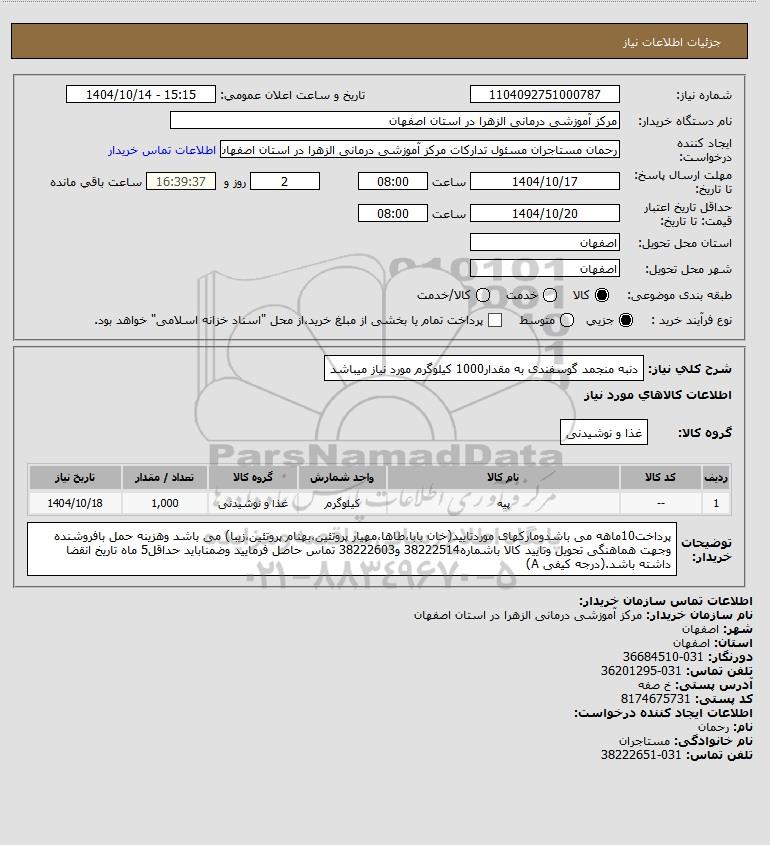 شرح کلی نیاز: دنبه منجمد گوسفندی به مقدار1000 کیلوگرم مورد نیاز میباشد