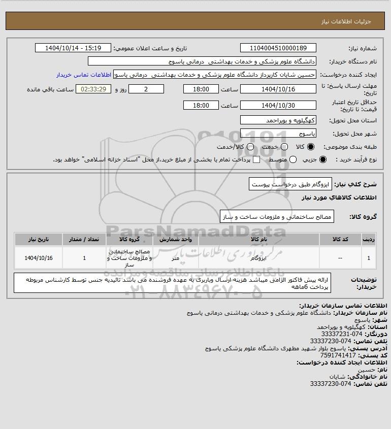 شرح کلی نیاز: ایزوگام طبق درخواست پیوست