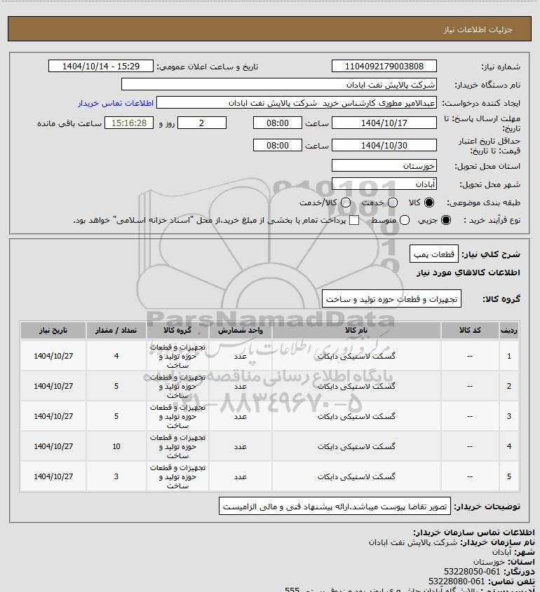 شرح کلی نیاز: قطعات پمپ