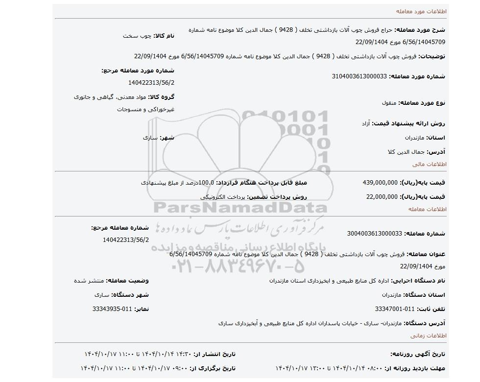 | شرح مورد معامله: حراج فروش چوب آلات بازداشتی تخلف ( 9428 ) جمال الدین کلا موضوع نامه شماره 6/56/14045709 مورخ 22/09/1404 | نام کالا: چوب سخت | |