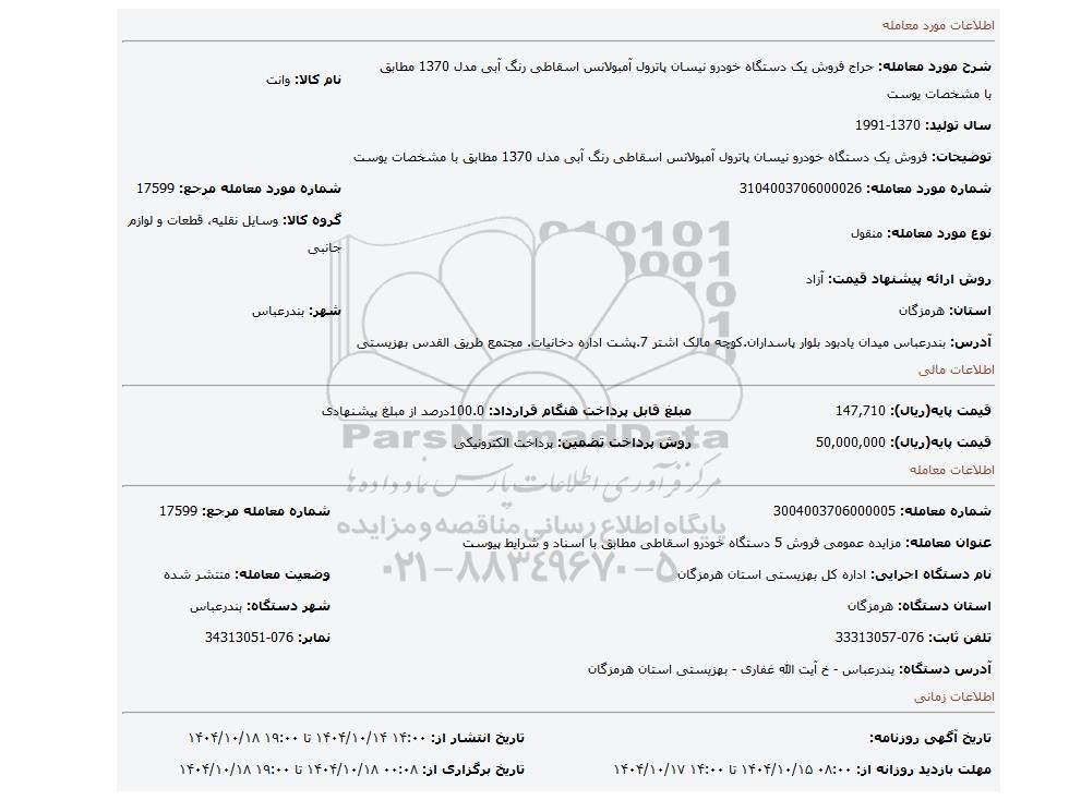 مزایده عمومی مزایده فروش یک دستگاه خودرو نیسان پاترول آمبولانس اسقاطی رنگ آبی مدل 1370 مطابق با مشخصات یوست برگزار میگردد. از کلیه افراد متخصص و شرکت‌های واجد شرایط دعوت به عمل می‌آید تا در این مزایده با کد خبرگزاری پارس نماد : 10092199 شرکت نمایند تاریخ شروع مزایده : 1404/10/14 مهلت شرکت در مزایده: تا پایان روز 1404/10/18 مکان برگزاری اموال واگذاری استان‌های مزایدات استان هرمزگان و دسته‌بندی‌های مربوط به این حراجی انواع خودرو سبک میباشد.