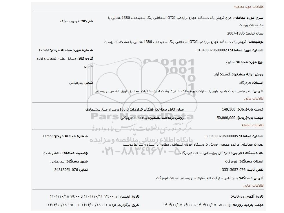 مزایده عمومی مزایده فروش یک دستگاه خودرو پرایدصبا GTXI اسقاطی رنگ سفیدمدل 1386 مطابق با مشخصات یوست برگزار میگردد. از کلیه افراد متخصص و شرکت‌های واجد شرایط دعوت به عمل می‌آید تا در این مزایده با کد خبرگزاری پارس نماد : 10095402 شرکت نمایند تاریخ شروع مزایده : 1404/10/14 مهلت شرکت در مزایده: تا پایان روز 1404/10/18 مکان برگزاری اموال واگذاری استان‌های مزایدات استان هرمزگان و دسته‌بندی‌های مربوط به این حراجی انواع خودرو سبک میباشد.