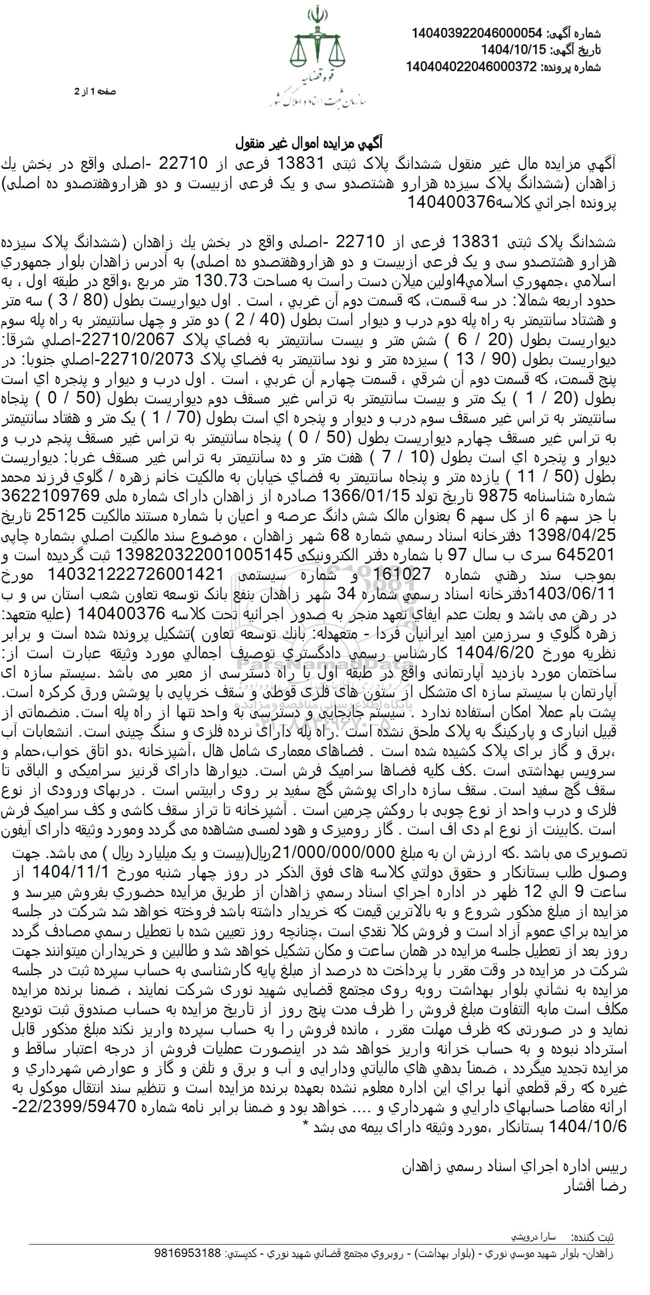 ششدانگ پلاک ثبتی 13831 فرعی از 22710 اصلی واقع در بخش یک راهدان ششدانگ پلاک سپرده هزار و هشتصد و سی و یک فرعی از بیست و دو هزار و هفتصد و ده اصلی به آدرس زاهدان بلوار جمهوری اسلامی جمهوری اسلامی 4 اولین میلان دست راست به مساحت 130.73 متر مربع واقع در طبقه اول، به حدود اربعه شمالا در سه قسمت که قسمت دوم آن غربی است. اول دیواریست بطول (80 . 3 ) سه متر و هشتاد سانتیمتر به راه پله دوم درب و دیوار است بطول 40 . 2 ) دو متر و چهل سانتیمتر به راه پله سوم دیواریست بطول 20 . 6 ) شش متر و بیست سانتیمتر به فضای پلاک 22710.2067 - اصلی شرقا دیواریست بطول 90 . 13 ) سپرده متر و نود سانتیمتر به فضای پلاک 22710.2073- اصلی جنوبا در پنج قسمت که قسمت دوم آن شرقی ، قسمت چهارم آن عربی است. اول درب و دیوار و پنجره ای است بطول 20 . 1 ) یک متر و بیست سانتیمتر به تراس غیر مسقف دوم دیواریست بطول (50 . 0 ) پنجاه سانتیمتر به تراس غیر مسقف سوم درب و دیوار و پنجره ای است بطول (70 . 1 ) یک متر و هفتاد سانتیمتر به تراس غیر مسقف چهارم دیواریست بطول (50 . 0 ) پنجاه سانتیمتر به تراس غیر مسقف پنجم درب و دیوار و پنجره ای است بطول 10 . 7  هفت متر و ده سانتیمتر به تراس غیر مسقف غربا دیواریست بطول (50 . 11 ) بارده متر و پنجاه سانتیمتر به فضای خیابان به مالکیت خانم زهره . گلوی فرزند محمد 3622109769 شماره شناسنامه 9875 تاریخ تولد 1366.01.15 صادره از زاهدان دارای شماره ملی با جر سهم 6 از کل سهم 6 بعنوان مالک شش دانگ عرصه و اعیان با شماره مستند مالکیت 25125 تاریخ 1398.04.25 دفترخانه اسناد رسمی شماره 68 شهر زاهدان ، موضوع سند مالکیت اصلی بشماره چاپی 645201 سری به سال 97 با شماره دفتر الکترونیکی 139820322001005145 ثبت گردیده است و بموجب سند رهنی شماره 161027 و شماره سیستمی 140321222726001421 مورخ 1403.06.11 دفترخانه اسناد رسمی شماره 34 شهر زاهدان بنفع بانک توسعه تعاون شعب استان س و ب در رهن می باشد و بعلت عدم ایفای تعهد منجر به صدور اجرائیه تحت كلاسه 140400376 ( علیه متعهد : زهره گلوی و سرزمین امید ایرانیان فردا - متعهدله بانك توسعه تعاون تشکیل پرونده شده است و برابر نظریه مورخ 1404.6.20 کارشناس رسمی دادگستری توصیف اجمالی مورد وثیقه عبارت است از: ساختمان مورد بازدید آپارتمانی واقع در طبقه اول با راه دسترسی از معبر می باشد . سیستم سازه ای آپارتمان با سیستم سازه ای متشکل از ستونهای قاری قوطی و سقف خریایی با پوشش ورق کرکره است. پشت بام عملا امکان استفاده ندارد . سیستم جابجایی و دسترسی به واحد تنها از راه پله است. منضماتی از قبیل انباری و پارکینگ به پلاک ملحق نشده است. راه پله دارای نرده فلزی و سنگ چینی است. انشعابات آب برق و گاز برای پلاک کشیده شده است. فضاهای معماری شامل هال آشپزخانه ، دو اتاق خواب حمام و سرویس بهداشتی است . کف کلیه فضاها سرامیک فرش است. دیوارها دارای قرنیز سرامیکی و الباقی تا سقف گچ سفید است. سقف سازه دارای پوشش گچ سفید بر روی رابیتس است. دربهای ورودی از نوع فاری و درب واحد از نوع چوبی با روکش چرمین است. اشپزخانه تا تراز سقف کاشی و کف سرامیک فرش است . کابینت از نوع ام دی اف است. گاز رومیزی و هود لمسی مشاهده می گردد و مورد وثیقه دارای ایفون تصویری میباشد که ارزش آن به مبلغ 21.000.000.000 ریال بیست و یک میلیارد ریال ) می باشد. جهت وصول طلب بستانکار و حقوق دولتی کلاسه های فوق الذکر در روز چهار شنبه مورخ 1404.11.1 از ساعت 9 الی 12 ظهر در اداره اجرای اسناد رسمی زاهدان از طریق مزایده حضوری بفروش میرسد و مزایده از مبلغ مذکور شروع و به بالاترین قیمت که خریدار داشته باشد فروخته خواهد شد شرکت در جلسه مزایده برای عموم آزاد است و فروش کلا نقدی است ، چنانچه روز تعیین شده با تعطیل رسمی مصادف گردد روز بعد از تعطیل جلسه مزایده در همان ساعت و مکان تشکیل خواهد شد و طالبین و خریداران میتوانند جهت شرکت در مزایده در وقت مقرر با پرداخت ده درصد از مبلغ پایه کارشناسی به حساب سپرده ثبت در جلسه مزایده به نشانی بلوار بهداشت روبه روی مجتمع قضایی شهید نوری شرکت نمایند. ضمنا برنده مزایده مکلف اس