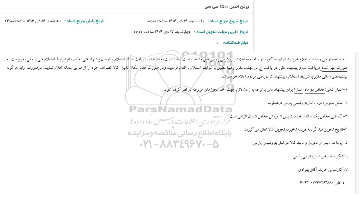به استحضار می رساند استعلام خرید تقاضای مذکور در سامانه معاملات پتروشیمی پارس قابل مشاهده است. لطفا نسبت به مشاهده دریافت اسناد استعلام و ارسال پیشنهاد فنی به انضمام شرایط استعلام فنی و مالی به پیوست به صورت مهر شده در پاکت ب و پیشنهاد مالی در پاکت ج در مهلت مقرر و عینا مطابق با شرایط استعلام ، اقدام فرمایید و در صورت عدم امکان تامین کالا انصراف خود را از طریق سامانه اعلام نمایید. در صورت ارایه هرگونه پیشنها دفنی و مالی مغایر با شرایط استعلام ، پیشنهادات دریافتی مردود اعلام خواهد شد.