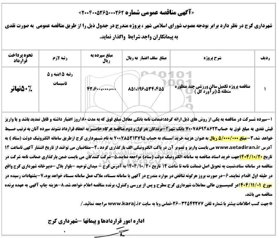 | 1 | مناقصه پروژه تکمیل سالن ورزشی چندمنظوره منطقه 5 (برآورد کل) | 851.196.534.455 | 42.600.000.000 | رتبه 5 ابنیه و 5 تاسیسات | 50% تهاتر |