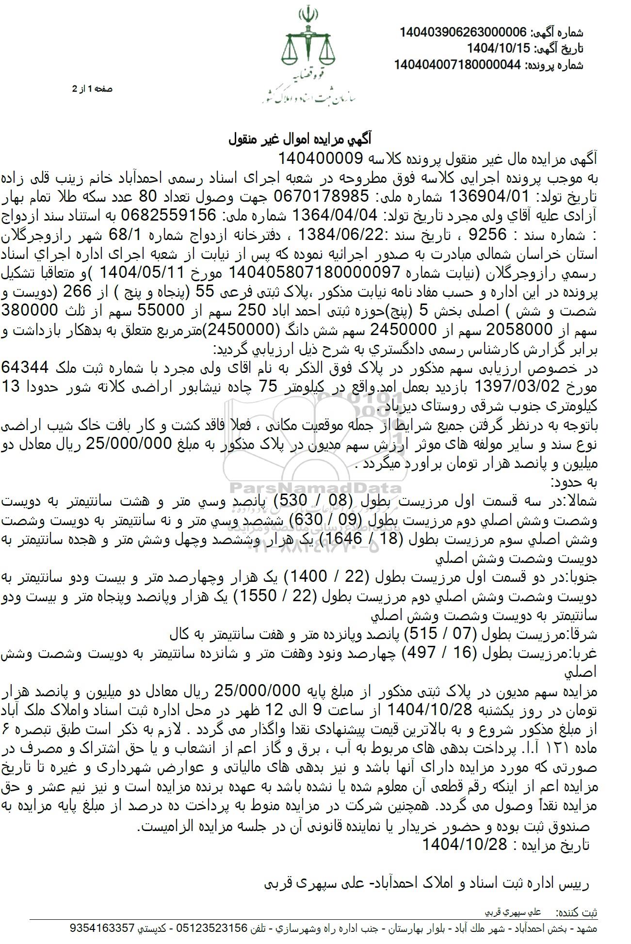 به موجب پرونده اجرایی کلاسه فوق مطروحه در شعبه اجرای اسناد رسمی احمدآباد خانم زینب قلی زاده تاریخ تولد: 136904.01 شماره ملی : 0670178985 جهت وصول تعداد 80 عدد سکه طلا تمام بهار آزادی علیه آقای ولى مجرد تاریخ تولد: 1364.04.04 شماره ملی 0682559156 به استناد سند ازدواج شماره سند : 9256 ، تاریخ سند : 1384.06.22 ، دفترخانه ازدواج شماره 68.1 شهر راز و جرگلان استان خراسان شمالی مبادرت به صدور اجرائیه نموده که پس از نیابت از شعبه اجرای اداره اجرای اسناد رسمی راز و جرگلان نیابت شماره 140405807180000097 مورخ 1404.05.11 ) و متعاقبا تشکیل پرونده در این اداره و حسب مفاد نامه نیابت مذکور ، پلاک ثبتی فرعی 55 پنجاه و پنج ( از 266 دویست و شصت و شش ) اصلی بخش 5 (پنج) حوزه ثبتی احمد آباد 250 سهم از 55000 سهم از ثلث 380000 سهم از 2058000 سهم از 2450000 سهم شش دانگ (2450000) متر مربع متعلق به بدهکار بازداشت و برابر گزارش کارشناس رسمی دادگستری به شرح ذیل ارزیابی گردید