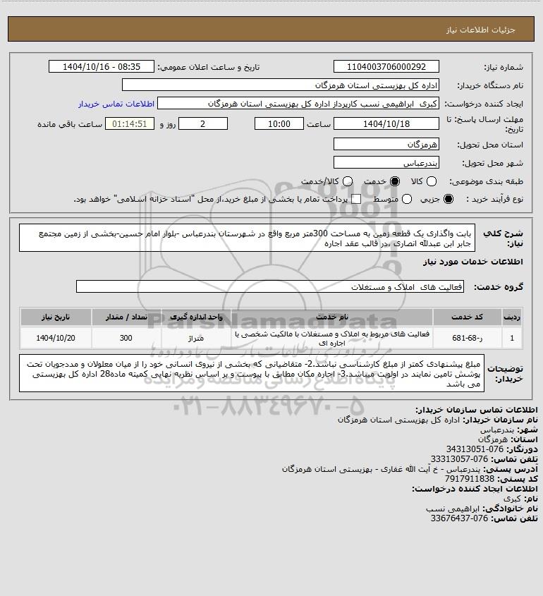 شرح کلی نیاز: بابت واگذاری یک قطعه زمین به مساحت 300متر مربع واقع در شهرستان بندرعباس -بلوار امام حسین-بخشی از زمین مجتمع جابر ابن عبدلله انصاری ،در قالب عقد اجاره