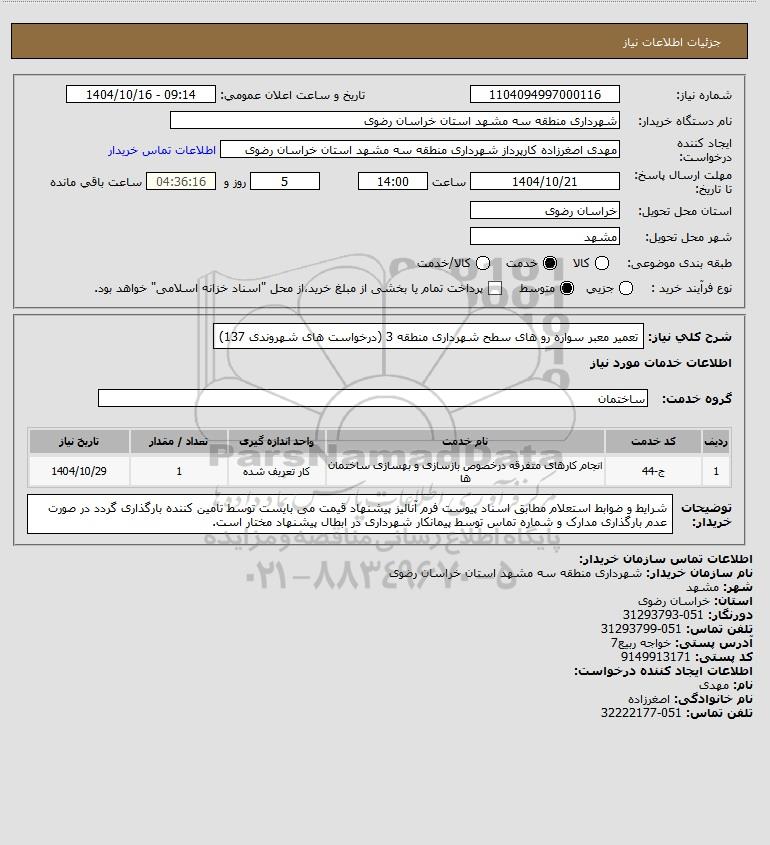 شرح کلی نیاز: تعمیر معبر سواره رو های سطح شهرداری منطقه 3 (درخواست های شهروندی 137)