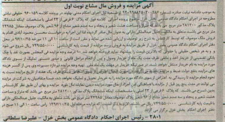 مزایده پلاک شش فرعی مال مشاع نوبت اول کلاسه 960159