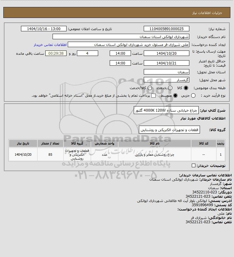 | 1 | -- | چراغ روشنایی معابر و پارکی | عدد | قطعات و تجهیزات الکتریکی و روشنایی | 85 | 1404/10/20 |