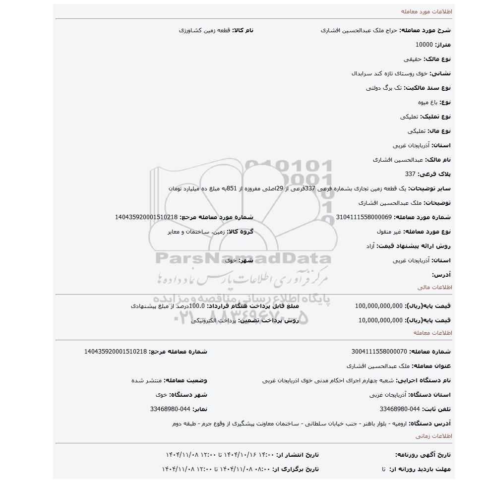 | قیمت پایه(ریال): 10,000,000,000 | روش پرداخت تضمین: پرداخت الکترونیکی |