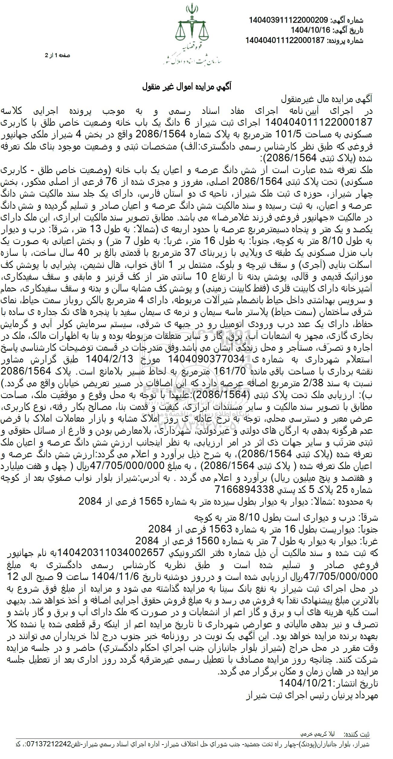 در اجرای ایین نامه اجرای معاد اسناد رسمی و به موجب پرونده اجرایی کلاسه 140404011122000187 اجرای ثبت شیراز 6 دانگ یک باب خانه وضعیت خاص طلق با کاربری مسکونی به مساحت 101/5 متر مربع به پلاک شماره 2086/1564 واقع در بخش 4 شیراز ملکی جهانپور فروغی که طبق نظر کارشناس رسمی دادگستری الف) مشخصات ثبتی و وضعیت موجود بنای ملک تعرفه ) شده پلاک ثبتى 2086/1564