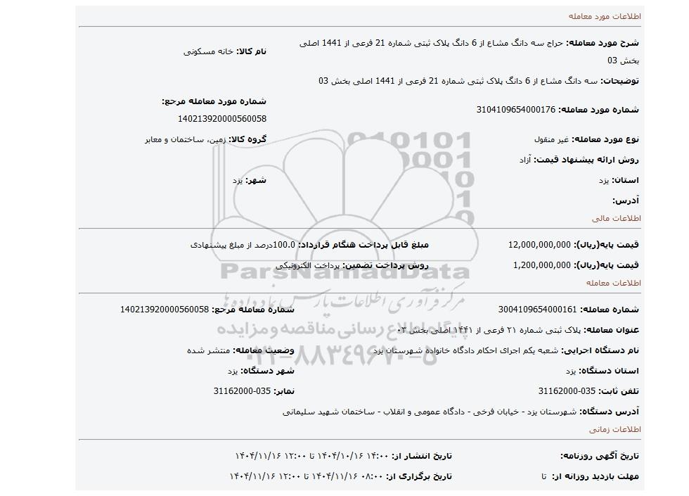 | شرح مورد معامله: حراج سه دانگ مشاع از 6 دانگ پلاک ثبتی شماره 21 فرعی از 1441 اصلی بخش 03 | نام کالا: خانه مسکونی | |