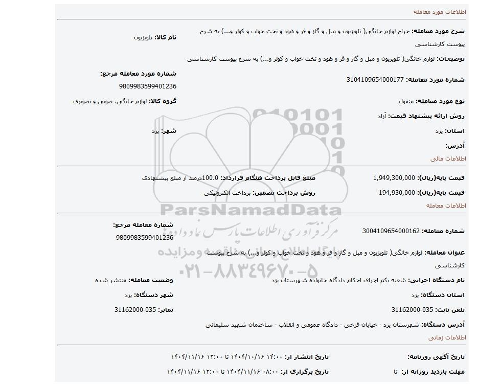 | شماره مورد معامله: 3104109654000177 | شماره مورد معامله مرجع: 9809983599401236 | |