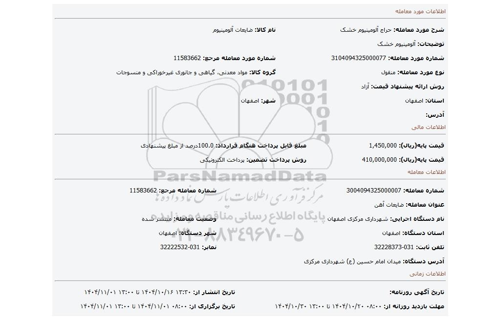 | شماره معامله: 3004094325000007 | شماره معامله مرجع: 11583662 | |