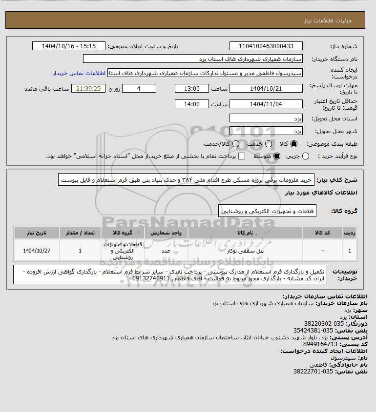 شرح کلی نیاز: خرید ملزومات برقی پروژه مسکن طرح اقدام ملی ۳۸۴ واحدی بنیاد بتن طبق فرم استعلام و فایل پیوست