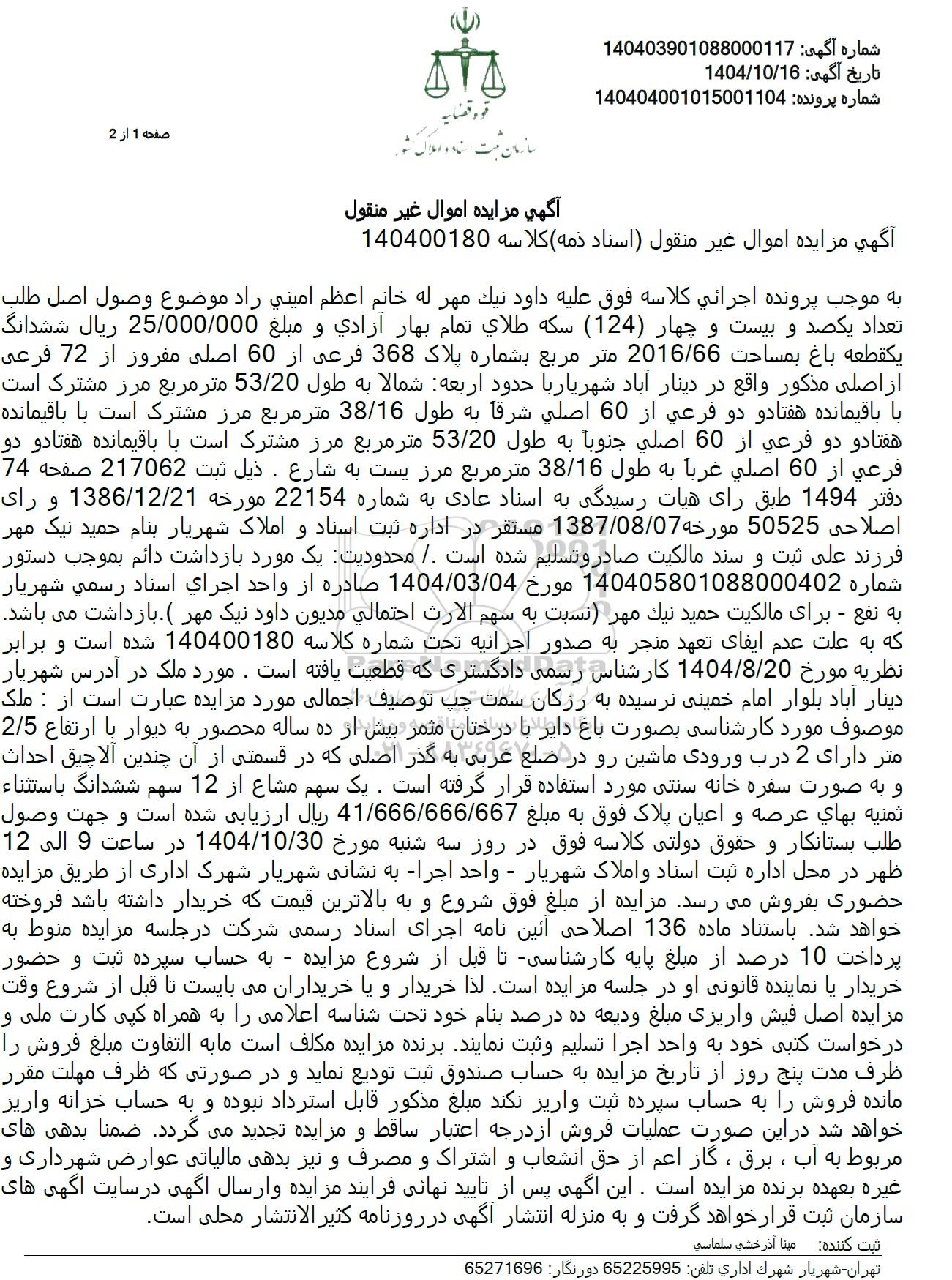 به موجب پرونده اجرائی کلاسه فوق علیه داود نیک مهر له خانم اعظم امینی راد موضوع وصول اصل طلب تعداد یکصد و بیست و چهار (124) سکه طلای تمام بهار آزادی و مبلغ 25.000.000 ریال ششدانگ یک قطعه باغ بمساحت 2016.66 متر مربع بشماره پلاک 368 فرعی از 60 اصلی مفروز از 72 فرعی از اصلی مذکور واقع در دینار آباد شهریار با حدود اربعه شمالا به طول 53.20 متر مربع مرز مشترک است. با باقیمانده هفتاد و دو فرعی از 60 اصلی شرقاً به طول 38.16 متر مربع مرز مشترک است با باقیمانده هفتادو دو فرعی از 60 اصلی جنوبا به طول 53.20 متر مربع مرز مشترک است با باقیمانده هفتادو دو فرعی از 60 اصلی غربا به طول 38.16 متر مربع مرز پست به شارع . ذیل ثبت 217062 صفحه 74 دفتر 1494 طبق رای هیات رسیدگی به اسناد عادی به شماره 22154 مورخه 1386.12.21 و رای اصلاحی 50525 مورخه 1387.08.07 مستقر در اداره ثبت اسناد و املاک شهریار بنام حمید نیک مهر فرزند على ثبت و سند مالکیت صادر و تسلیم شده است .. محدودیت یک مورد بازداشت دائم بموجب دستور شماره 140405801088000402 مورخ 1404.03.04 صادره از واحد اجرای اسناد رسمی شهریار به نفع - براى مالکیت حمید نیک مهر نسبت به سهم الارث احتمالی مدیون داود نیک مهر بازداشت می باشد. که به علت عدم ایفای تعهد منجر به صدور اجرائیه تحت شماره کلاسه 140400180 شده است و برابر نظریه مورخ 1404.8.20 کارشناس رسمی دادگستری که قطعیت یافته است. مورد ملک در آدرس شهریار دینار آباد بلوار امام خمینی نرسیده به رزکان سمت چپ توصیف اجمالی مورد مزایده عبارت است از : ملک موصوف مورد کارشناسی بصورت باغ دایر با درختان مثمر بیش از ده ساله محصور به دیوار با ارتفاع 2.5 متر دارای 2 درب ورودی ماشین رو در ضلع غربی به گذر اصلی که در قسمتی از آن چندین آلاچیق احداث و به صورت سفره خانه سنتی مورد استفاده قرار گرفته است. یک سهم مشاع از 12 سهم ششدانگ باستثناء ثمنیه بهای عرصه و اعیان پلاک فوق به مبلغ 41.666.666.667 ریال ارزیابی شده است و جهت وصول طلب بستانکار و حقوق دولتی کلاسه فوق در روز سه شنبه مورخ 1404.10.30 در ساعت 9 الی 12 ظهر در محل اداره ثبت اسناد و املاک شهریار - واحد اجرا به نشانی شهریار شهرک اداری از طریق مزایده حضوری بفروش میرسد. مزایده از مبلغ فوق شروع و به بالاترین قیمت که خریدار داشته باشد فروخته خواهد شد. باستناد ماده 136 اصلاحی آئین نامه اجرای اسناد رسمی شرکت در جلسه مزایده منوط به پرداخت 10 درصد از مبلغ پایه کارشناسی تا قبل از شروع مزایده - به حساب سپرده ثبت و حضور خریدار یا نماینده قانونی او در جلسه مزایده است. لذا خریدار و یا خریداران می بایست تا قبل از شروع وقت مزایده اصل فیش واریزی مبلغ ودیعه ده درصد بنام خود تحت شناسه اعلامی را به همراه کپی کارت ملی و درخواست کتبی خود به واحد اجرا تسلیم و ثبت نمایند برنده مزایده مکلف است ما به التفاوت مبلغ فروش را ظرف مدت پنج روز از تاریخ مزایده به حساب صندوق ثبت تودیع نماید و در صورتی که ظرف مهلت مقرر مانده فروش را به حساب سپرده ثبت واریز نکند مبلغ مذکور قابل استرداد نبوده و به حساب خزانه واریز خواهد شد در این صورت عملیات فروش از درجه اعتبار ساقط و مزایده تجدید میگردد. ضمنا بدهی های مربوط به آب ، برق ، گاز اعم از حق انشعاب و اشتراک و مصرف و نیز بدهی مالیاتی عوارض شهرداری و غیره بعهده برنده مزایده است. این اگهی پس از تایید نهایی فرایند مزایده و ارسال آگهی در سایت آگهی های سازمان ثبت قرار خواهد گرفت و به منزله انتشار آگهی در روزنامه کثیر الانتشار محلی است.