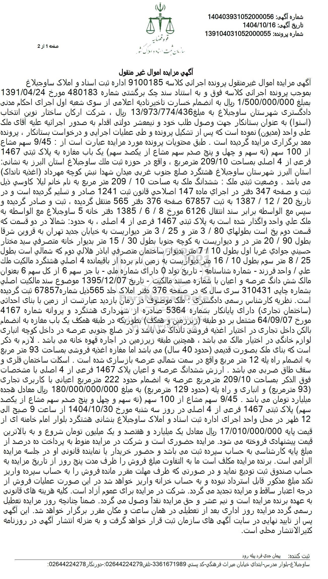 آگهی مزایده اموال غیر منقول پرونده اجرائی کلاسه 9100185 اداره ثبت اسناد و املاک ساوجبلاغ بموجب پرونده اجرائی کلاسه فوق و به استناد سند چک برگشتی شماره 480183 مورخ 1391.04.24 بمبلغ 1.500.000.000 ریال به انضمام خسارت تاخیر تادیه اعلامی از سوی شعبه اول اجرای احکام مدنی دادگستری شهرستان ساوجبلاغ به مبلغ 13.973.774.436 ریال، شرکت ارکان ساختار نوین انتخاب (استوا) به عنوان بستانکار جهت وصول طلب خود و نیمعشر دولتی اقدام به صدور اجرائیه علیه آقای ملک على واحد (مديون) نموده است که پس از تشکیل پرونده و طی عملیات اجرایی و درخواست بستانکار ، پرونده معد برگزاری مزایده گردیده است. طبق محتویات پرونده مورد مزایده عبارت است از : 9.45 سهم مشاع از 100 سهم نه سهم و چهل و پنج صدم سهم مشاع از یکصد سهم یک باب مغازه به پلاک ثبتی 1467 فرعی از 4 اصلی بمساحت 209.10 متر مربع، واقع در حوزه ثبت ملك ساوجبلاغ استان البرز به نشانی استان البرز شهرستان ساوجبلاغ هشتگرد ضلع جنوب غربی میدان شهدا نبش کوچه مهرداد اغذیه نانداک می باشد . وضعیت ثبتی ملک : ششدانگ ملک به مساحت 209.10 متر مربع به نام خانم لیلا كاوسي ذيل ثبت و صفحه 347 دفتر در اجرای ماده 147 اصلاحی قانون ثبت 1241 صادر و تسلیم گردیده است و در تاريخ 20 . 12 . 1387 به ثبت 67857 صفحه 376 دفتر 565 منتقل گردیده، ثبت و صادر گردیده و سيس مع الواسطه برابر سند انتقال 6126 مورخ 8 . 6 . 1385 دفتر خانه 5 ساوجبلاغ مع الواسطه به ملک علي واحد واگذار شده است به پلاک ثبتی 1467 فرعی از 4 اصلی، به حدود شمالا در دو قسمت که قسمت دوم یخ است بطولهاي 80 . 3 متر و 25 . 3 متر دیواریست به خیابان جدید تهران به قزوین شرقا بطول 90 . 20 متر در و دیواریست به کوچه جنوبا بطول 30 . 15 متر بدیوار خانه متصرفي سيد مختار حسيني جوادي غربا اول بطول 10 . 7 متر بدیوار ساختمان متصرفي اباذر هلالي دوم که شمالی است بطول 25 . 8 متر سوم بطول 10 . 16 متر دیواریست به زمین نام برده از باقیمانده 4 اصلی هشتگرد مالکيت ملك علي . واحد فرزند - شماره شناسنامه - تاریخ تولد 0 دارای شماره ملی - با جر سهم 6 از کل سهم 6 بعنوان مالک شش دانگ عرصه و اعیان با شماره مستند مالکیت - تاریخ 1395.12.07 موضوع سند مالكيت اصلي بشماره چاپی 310431 سری سال که در صفحه 376 دفتر املاک جلد 565 ذیل شماره 67857 ثبت گردیده است. نظریه کارشناس رسمی دادگستری : ملک موصوف در زمان بازدید عبارتست از زمین با بنای احداثی ساختمان تجاری دارای پایانکار بشماره 5364 صادره از شهرداری هشتگرد و پروانه شماره 4167 مورخ 64.09.07 مشتمل بر دو طبقه زیرزمین و همکف بطوریکه در طبقه همکف یک باب مغازه به انضمام بالکن داخل تجاری در اختیار اغذیه فروشی نانداک میباشد و در ضلع جنوبی عرصه در داخل کوچه انباری لوازم خانگی در اختیار مالک میباشد ، همچنین طبقه زیرزمین در اجاره قهوه خانه می باشد . لازم به ذکر است که بنای ملک بصورت قدیمی (حدود 40 سال میباشد اما مغازه اغذیه فروشی بمساحت 93 متر مربع به انضمام راه پله 12 متر مربع واقع در سمت شمالی عرصه بازسازی شده است. اسکلت ساختمان فلزی و سقف طاق ضربی میباشد. ارزش ششدانگ عرصه و اعیان پلاک 1467 فرعی از 4 اصلی با مشخصات فوق الذكر بمساحت 209.10 متر مربع عرصه به انضمام حدود 222 متر مربع اعیانی با کاربری تجاری (93) متر مربع) و انباری و راه پله حدود 129 متر مربع به مبلغ 180.000.000.000 ريال معادل هجده میلیارد تومان میباشد . 9.45 سهم مشاع از 100 سهم نه سهم و چهل و پنج صدم سهم مشاع از یکصد سهم) پلاک ثبتی 1467 فرعی از 4 اصلی در روز سه شنبه مورخ 1404.10.30 از ساعت 9 صبح الی 12 ظهر در محل واحد اجرای اداره ثبت اسناد و املاک ساوجبلاغ بنشانی هشتگرد بلوار امام خامنه ای از قیمت پایه 17.010.000.000 ریال معادل یک میلیارد و هفتصد و یک میلیون تومان شروع و به بالاترین قیمت پیشنهادی فروخته میشود. مزایده حضوری است و شرکت در مزایده منوط به پرداخت ده درصد از مبلغ پایه کارشناسی به حساب سپرده ثبت میباشد و حضور خریدار با نماینده قانونی او در جلسه مزایده الرامی است. برنده مزایده مکلف است ما به التفاوت مبلغ فروش را ظرف مدت پنج روز از 