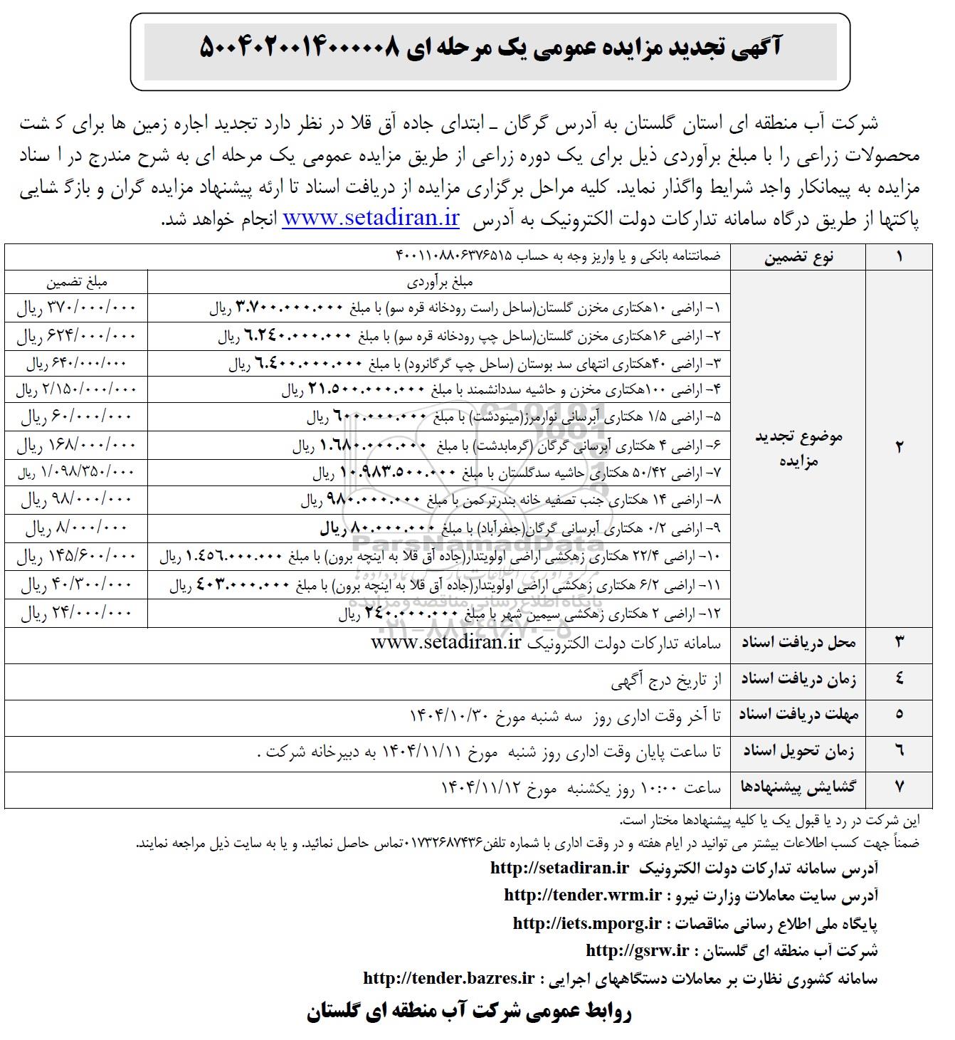 شرکت آب منطقه ای استان گلستان به آدرس گرگان - ابتدای جاده آق قلا در نظر دارد تجدید اجاره زمین ها برای کشت محصولات زراعی را با مبلغ برآوردی ذیل برای یک دوره زراعی از طریق مزایده عمومی یک مرحله ای به شرح مندرج در اسناد مزایده به پیمانکار واجد شرایط واگذار نماید کلیه مراحل برگزاری مزایده از دریافت اسناد تا ارئه پیشنهاد مزایده گران و بازگشایی پاکتها از طریق درگاه سامانه تدارکات دولت الکترونیک به آدرس سایت ستاد ایران انجام خواهد شد.