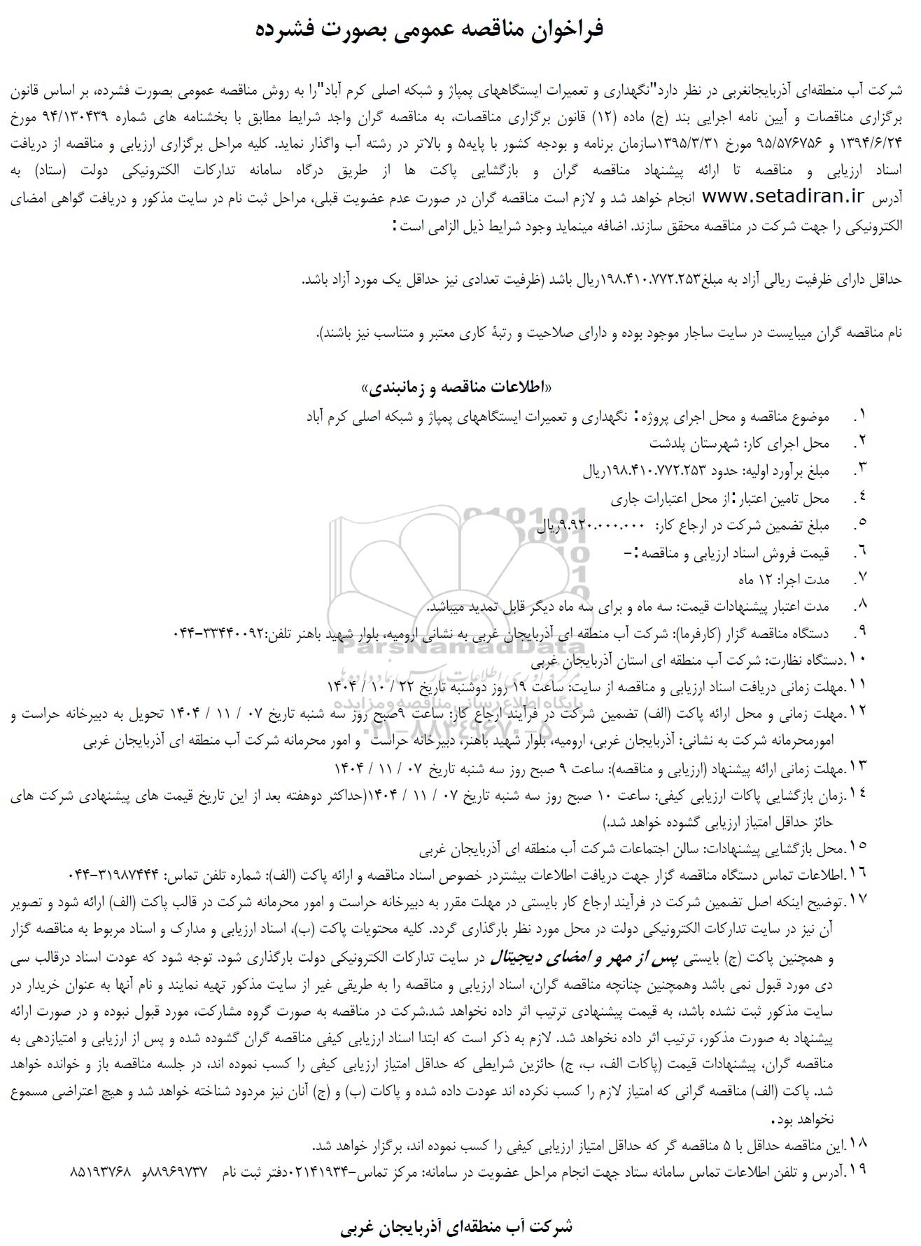 شرکت آب منطقه ای آذربایجانغربی در نظر دارد " نگهداری و تعمیرات ایستگاههای پمپاژ و شبکه اصلی کرم آباد " را به روش مناقصه عمومی بصورت فشرده، بر اساس قانون برگزاری ناقصات و آیین نامه اجرایی بند (ج) ماده (12) قانون برگزاری مناقصات به مناقصه گران واجد شرایط مطابق با بخشنامه های شماره 94.130439 مورخ 1394.6.24 و 95.576756 مورخ 1395.3.31 سازمان برنامه و بودجه کشور با پایه 5 و بالاتر در رشته آب واگذار نماید. کلیه مراحل برگزاری ارزیابی و مناقصه از دریافت اسناد ارزیابی و مناقصه تا ارائه پیشنهاد مناقصه گران و بازگشایی پاکتها از طریق درگاه سامانه تدارکات الکترونیکی دولت (ستاد) به آدرس سایت ستاد ایران انجام خواهد شد و لازم است مناقصه گران در صورت عدم عضویت قبلی مراحل ثبت نام در سایت مذکور و دریافت گواهی امضای الکترونیکی را جهت شرکت در مناقصه محقق سازند. اضافه مینماید وجود شرایط ذیل الزامی است :