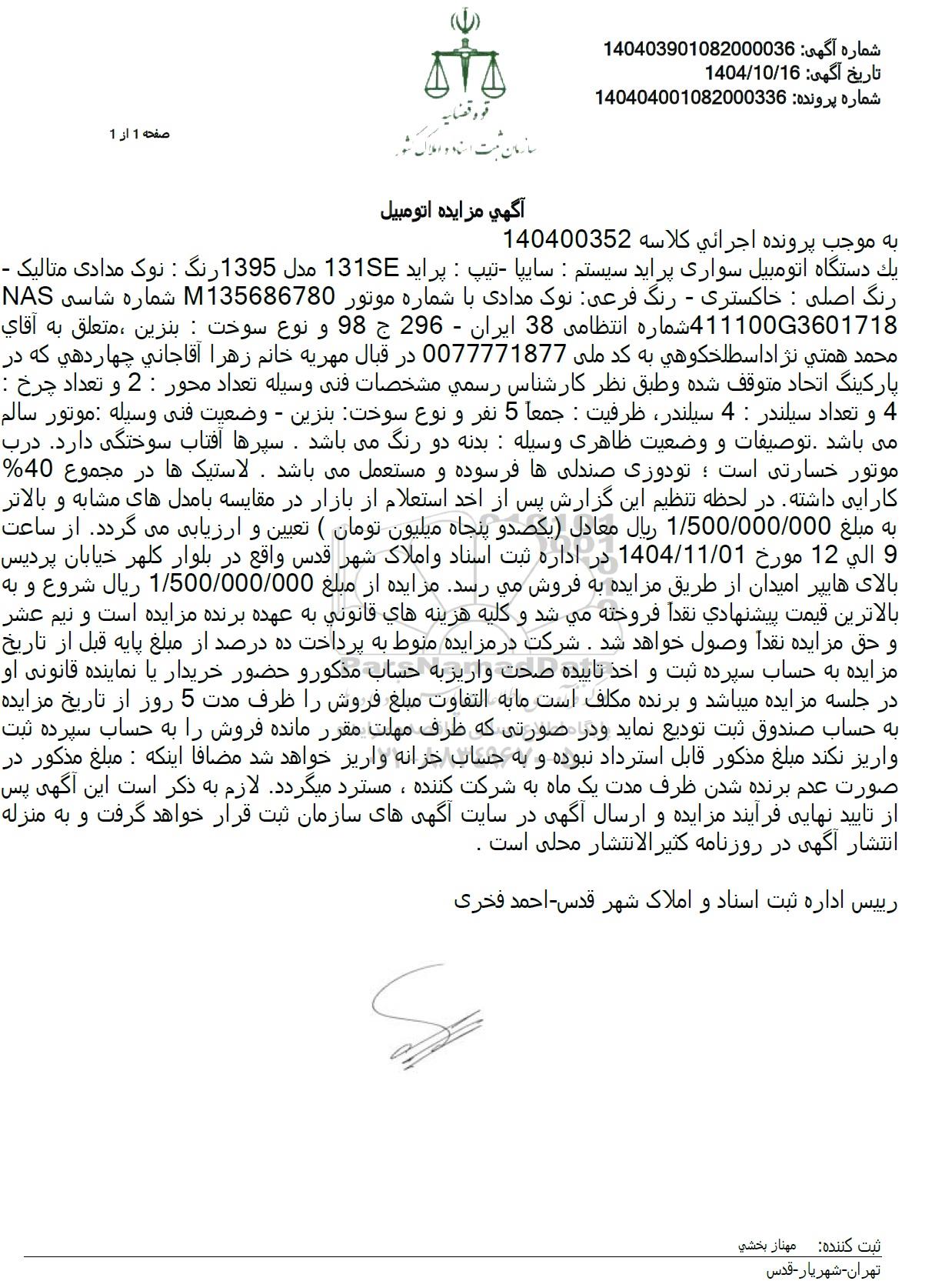 به موجب پرونده اجرائی کلاسه 140400352 یک دستگاه اتومبیل سواری پراید سیستم : سایپا - تیپ : پراید 131SE مدل 1395 رنگ : نوک مدادی متالیک -رنگ اصلی : خاکستری - رنگ فرعی نوک مدادی با شماره موتور 135686780 شماره شاسی NAS 411100G3601718 شماره انتظامی 38 ایران - 296 ج 98 و نوع سوخت : بنزین ، متعلق به آقای محمد همتی نژاد اسطلخکوهی به کد ملی 0077771877 در قبال مهریه خانم زهرا آقاجانی چهاردهی که در پارکینگ اتحاد متوقف شده و طبق نظر کارشناس رسمی مشخصات فنی وسیله تعداد محور : 2 و تعداد چرخ : 4 و تعداد سیلندر 4 سیلندر ظرفیت : جمعا 5 نفر و نوع سوخت بنزین - وضعیت فنی وسیله موتور سالم می باشد. توصیفات و وضعیت ظاهری وسیله : بدنه دو رنگ میباشد. سپرها آفتاب سوختگی دارد. درب موتور خسارتی است ؛ تودوزی صندلی ها فرسوده و مستعمل میباشد. لاستیکها در مجموع 40% کارایی داشته در لحظه تنظیم این گزارش پس از اخذ استعلام از بازار در مقایسه با مدلهای مشابه و بالاتر به مبلغ 1.500.000.000 ریال معادل یکصد و پنجاه میلیون تومان ( تعیین و ارزیابی می گردد. از ساعت 9 الی 12 مورخ 1404.11.01 در اداره ثبت اسناد و املاک شهر قدس واقع در بلوار کلهر خیابان پردیس بالای هایپر امیدان از طریق مزایده به فروش میرسد. مزایده از مبلغ 1.500.000.000 ریال شروع و به بالاترین قیمت پیشنهادی نقدا فروخته می شد و کلیه هزینه های قانونی به عهده برنده مزایده است و نیم عشر و حق مزایده نقدا وصول خواهد شد. شرکت در مزایده منوط به پرداخت ده درصد از مبلغ پایه قبل از تاریخ مزایده به حساب سپرده ثبت و اخذ تاییده صحت واریز به حساب مذکور و حضور خریدار یا نماینده قانونی او در جلسه مزایده میباشد و برنده مکلف است ما به التفاوت مبلغ فروش را ظرف مدت 5 روز از تاریخ مزایده به حساب صندوق ثبت تودیع نماید و در صورتی که ظرف مهلت مقرر مانده فروش را به حساب سپرده ثبت واریز نکند مبلغ مذکور قابل استرداد نبوده و به حساب خزانه واریز خواهد شد مضافا اینکه : مبلغ مذکور در صورت عدم برنده شدن ظرف مدت یک ماه به شرکت کننده، مسترد میگردد. لازم به ذکر است این آگهی پس از تایید نهایی فرآیند مزایده و ارسال آگهی در سایت آگهی های سازمان ثبت قرار خواهد گرفت و به منزله انتشار آگهی در روزنامه کثیر الانتشار محلی است .