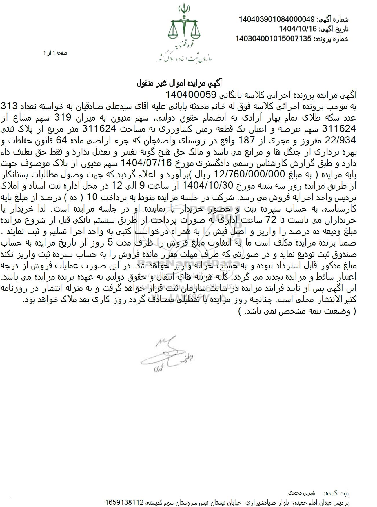 به موجب پرونده اجرائي كلاسه فوق له خانم محدثه بابائی علیه آقای سید علی صادقیان به خواسته تعداد 313 عدد سکه طلای تمام بهار آزادی به انضمام حقوق دولتی سهم مدیون به میزان 319 سهم مشاع از 311624 سهم عرصه و اعیان یک قطعه زمین کشاورزی به مساحت 311624 متر مربع از پلاک ثبتی 22/934 مفروز و مجزی از 187 واقع در روستای و اصفحان که جزء اراضی ماده 64 قانون حفاظت و بهره برداری از جنگل ها و مراتع میباشد و مالک حق هیچ گونه تغییر و تعدیل ندارد و فقط حق تعلیف دام دارد و طبق گزارش کارشناس رسمی دادگستری مورخ 1404.07.16 سهم مدیون از پلاک موصوف جهت پایه مزایده ) به مبلغ 12.760.000.000 ریال برآورد و اعلام گردید که جهت وصول مطالبات بستانکار از طریق مزایده روز سه شنبه مورخ 1404.10.30 از ساعت 9 الی 12 در محل اداره ثبت اسناد و املاک پردیس واحد اجرابه فروش میرسد شرکت در جلسه مزایده منوط به پرداخت 10 ) ده ) درصد از مبلغ پایه کارشناسی به حساب سپرده ثبت و حضور خریدار یا نماینده او در جلسه مزایده است. لذا خریدار یا خریداران می بایست تا 72 ساعت اداری به صورت پرداخت از طریق سیستم بانکی قبل از شروع مزایده مبلغ ودیعه ده درصد را واریز و اصل فیش را به همراه درخواست کتبی به واحد اجرا تسلیم و ثبت نمایند . ضمنا برنده مزایده مکلف است ما به التفاوت مبلغ فروش را ظرف مدت 5 روز از تاریخ مزایده به حساب صندوق ثبت تودیع نماید و در صورتی که ظرف مهلت مقرر مانده فروش را به حساب سپرده ثبت واریز نکند مبلغ مذکور قابل استرداد نبوده و به حساب خزانه واریز خواهد شد. در این صورت عملیات فروش از درجه اعتبار ساقط و مزایده تجدید میگردد کلیه هزینه های انتقال و حقوق دولتی به عهده برنده مزایده می باشد. این آگهی پس از تایید فرآیند مزایده در سایت سازمان ثبت قرار خواهد گرفت و به منزله انتشار در روزنامه كثیر الانتشار محلی است. چنانچه روز مزایده با تعطیلی مصادف گردد روز کاری بعد ملاک خواهد بود. ) وضعیت بیمه مشخص نمی باشد. )
