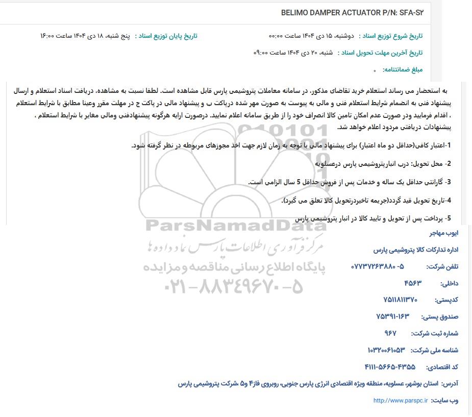 استعلام بها و موضوع استعلام استعلام BELIMO DAMPER ACTUATOR P/N: SFA-SY به اطلاع کلیه شرکت‌ها و افراد متخصص واجد شرایط می‌رساند، آگهی گذار در نظر دارد از طریق استعلام بها، نسبت به انتخاب و دریافت پیشنهادات اقدام نماید. این استعلام با کد آگهی ثبت شده در سامانه خبرگزاری پارس نماد : 10105714 منتشر شده است. مشخصات استعلام : تاریخ شروع استعلام: 1404/10/16 آخرین مهلت ارسال پیشنهاد قیمت : 1404/10/18 و محل اجرای پروژه : استان مناقصات استان بوشهر میباشد. استعلام قیمت مورد درخواست : استعلام BELIMO DAMPER ACTUATOR P/N: SFA-SY با دسته‌بندی‌های تخصصی و گروه های مرتبط : کمپرسورهای هوا, تجهیزات نفت و گاز, تجهیزات و ماشین آلات صنعتی, استعلام اطلاع رسانی میگردد.